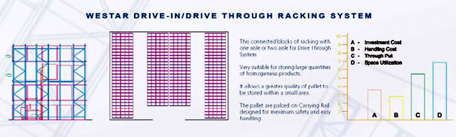 Drive In Pallet Rack is recommeded for the bulk storage of palletised loads where stock rotation is not critical. The main advantage of the system is the high utilisation of available